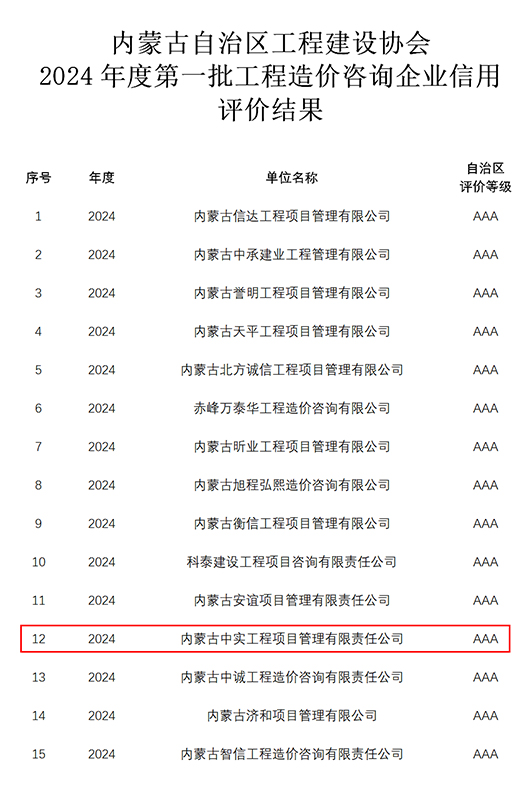 2024-07-3015173 次近期,我公司參加內(nèi)蒙古自治區(qū)工程建設(shè)協(xié)會組織的“2024年度第一批工程造價(jià)咨詢企業(yè)信用”申報(bào),獲得“信用AAA級證書”。我公司成立多年以來,遵循中國工程造價(jià)管理協(xié)會對造價(jià)咨詢企…
